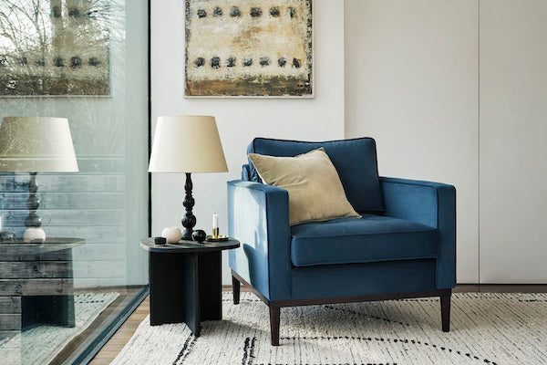 Although blue is a cool-toned colour, it’s still versatile enough as a choice for armchairs. This makes for easy styling as blue accent chairs work either with other cool tones or warm, richer colours.