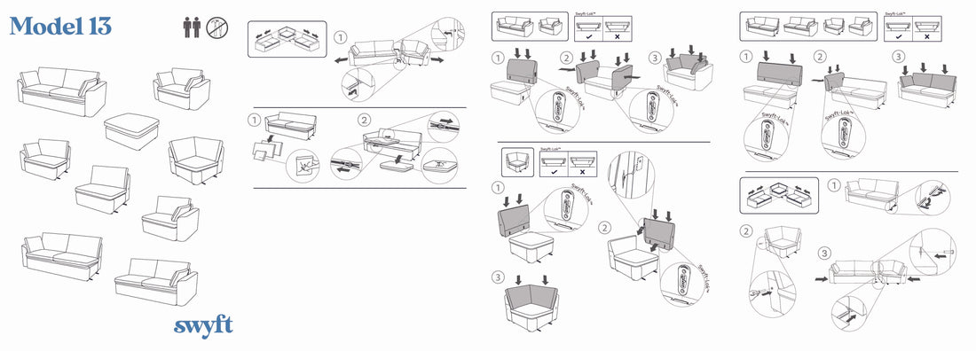 Welcome to the pinnacle of the Model 13 collection. This is modular in full effect, with five generous seats, a plush ottoman, and endless configurations to fit your life. Deep, feather-filled cushions promise ultimate comfort, while the bases lock together securely with Swyft-Lok and crocodile connectors for ease. The ottoman moves wherever you need it: Coffee table, footrest, or extra seat, and the removable covers make life easier for when spillages happen.